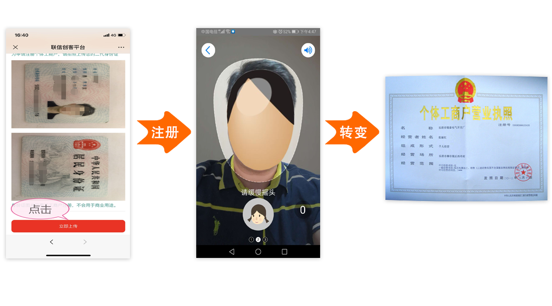 個人通過聯英創客平臺成為創客,只需要登錄關注公眾號“聯信創客之家”——選擇“在線注冊”即可,在線提交身份證和視頻活體檢測,認證通過后即可獲得電子營業執照。